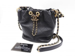 Chanel Top Handle Drawstring Chain Bag Shoulder Bag Lambskin Black Gold X-8525
