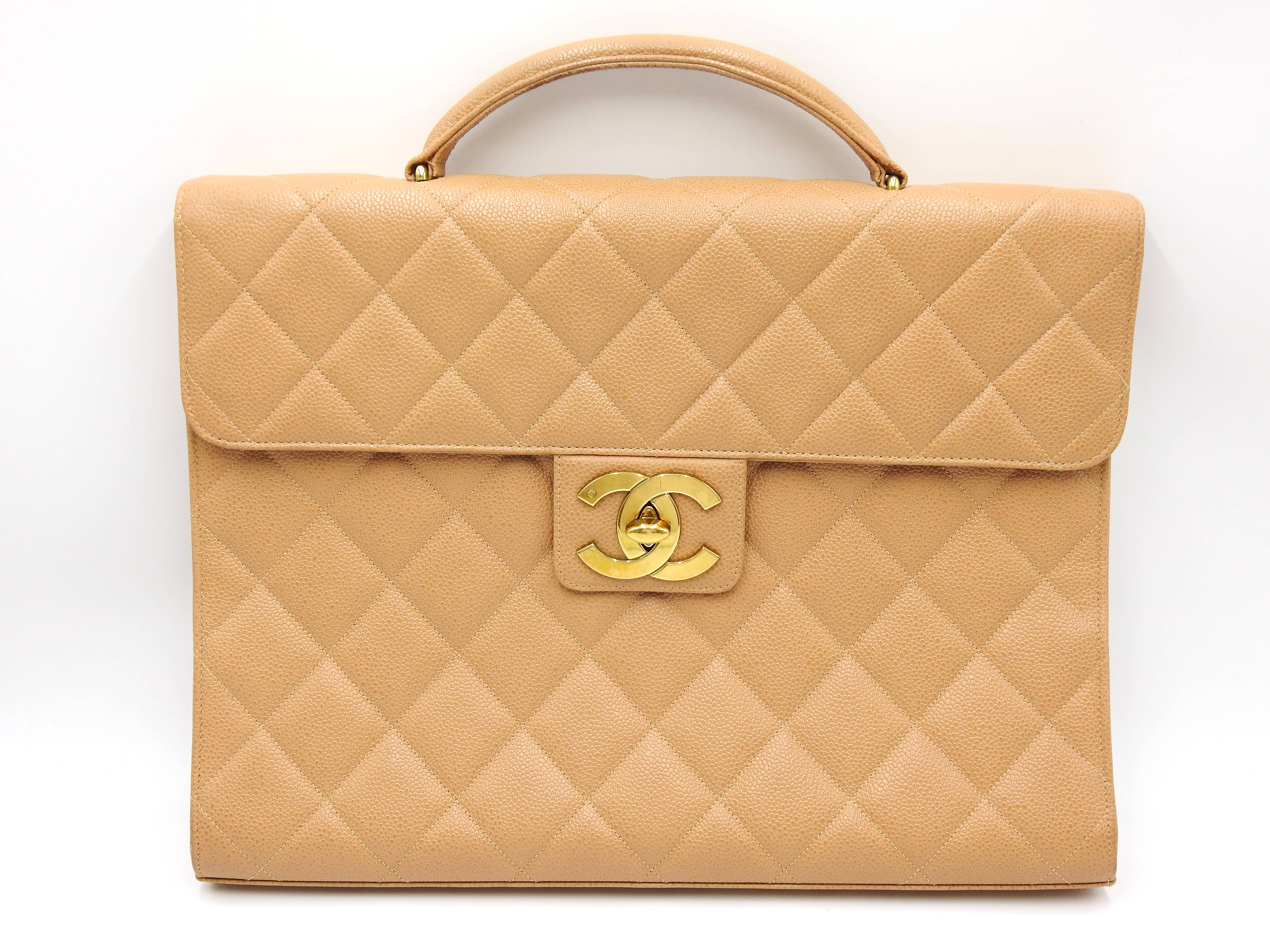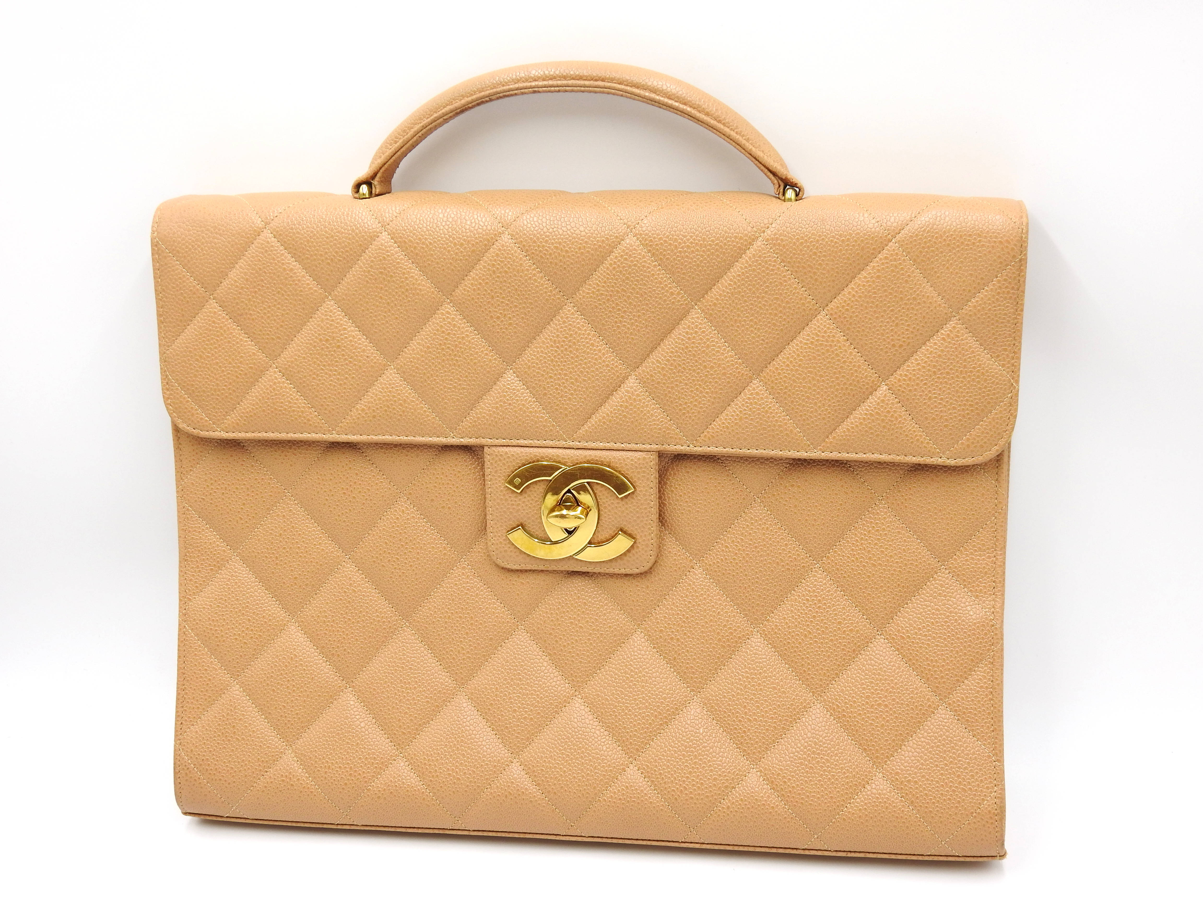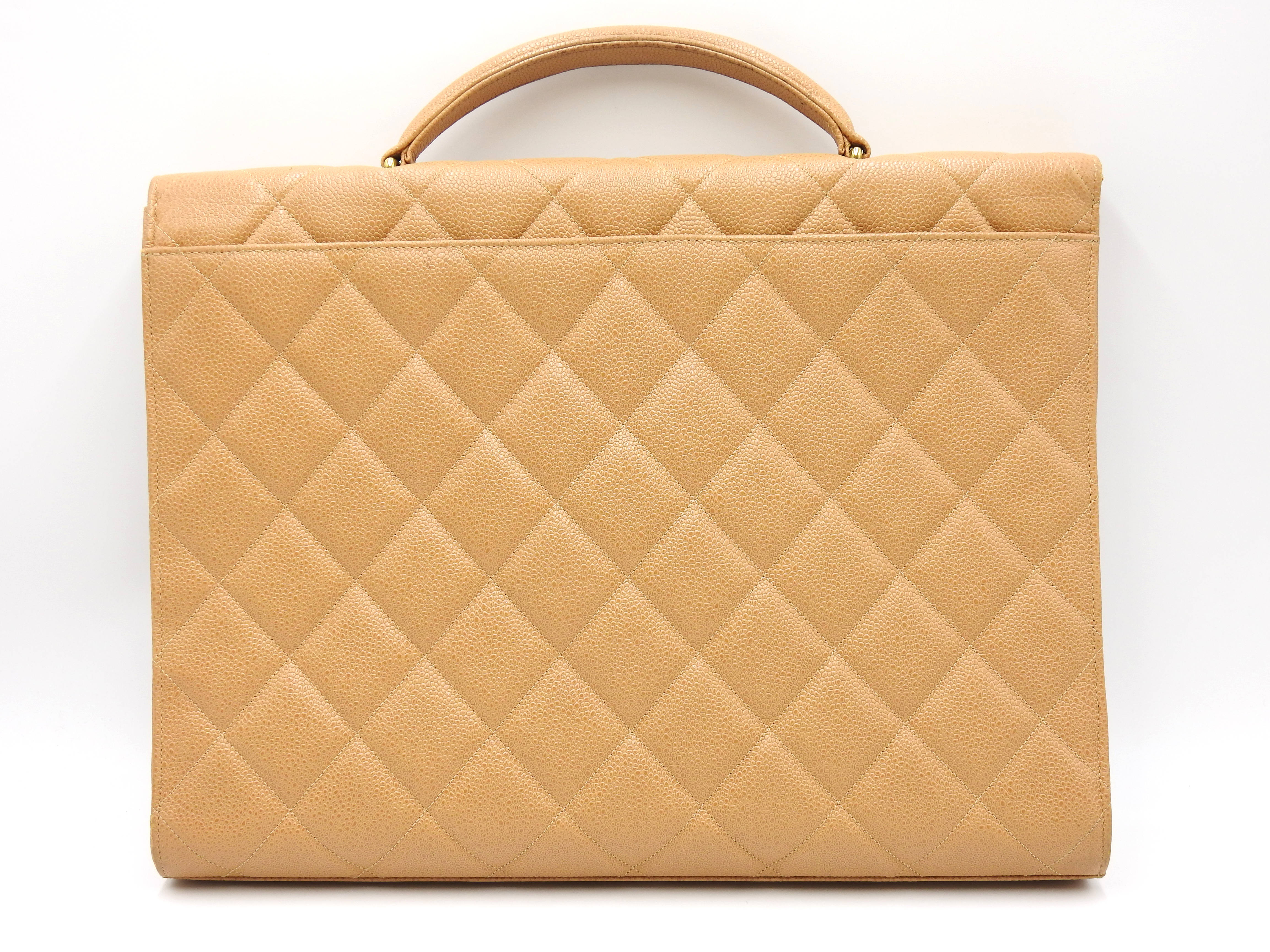 Auth CHANEL CC Matelasse Briefcase Business Bag Caviarskin Leather Beige Gold Hardware A02794 X-9057