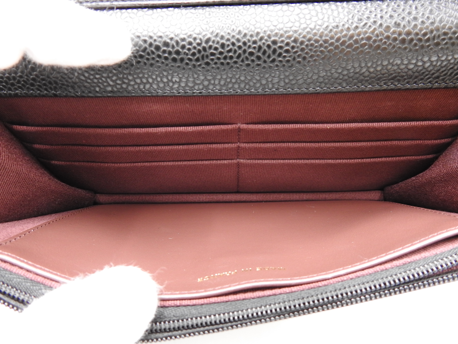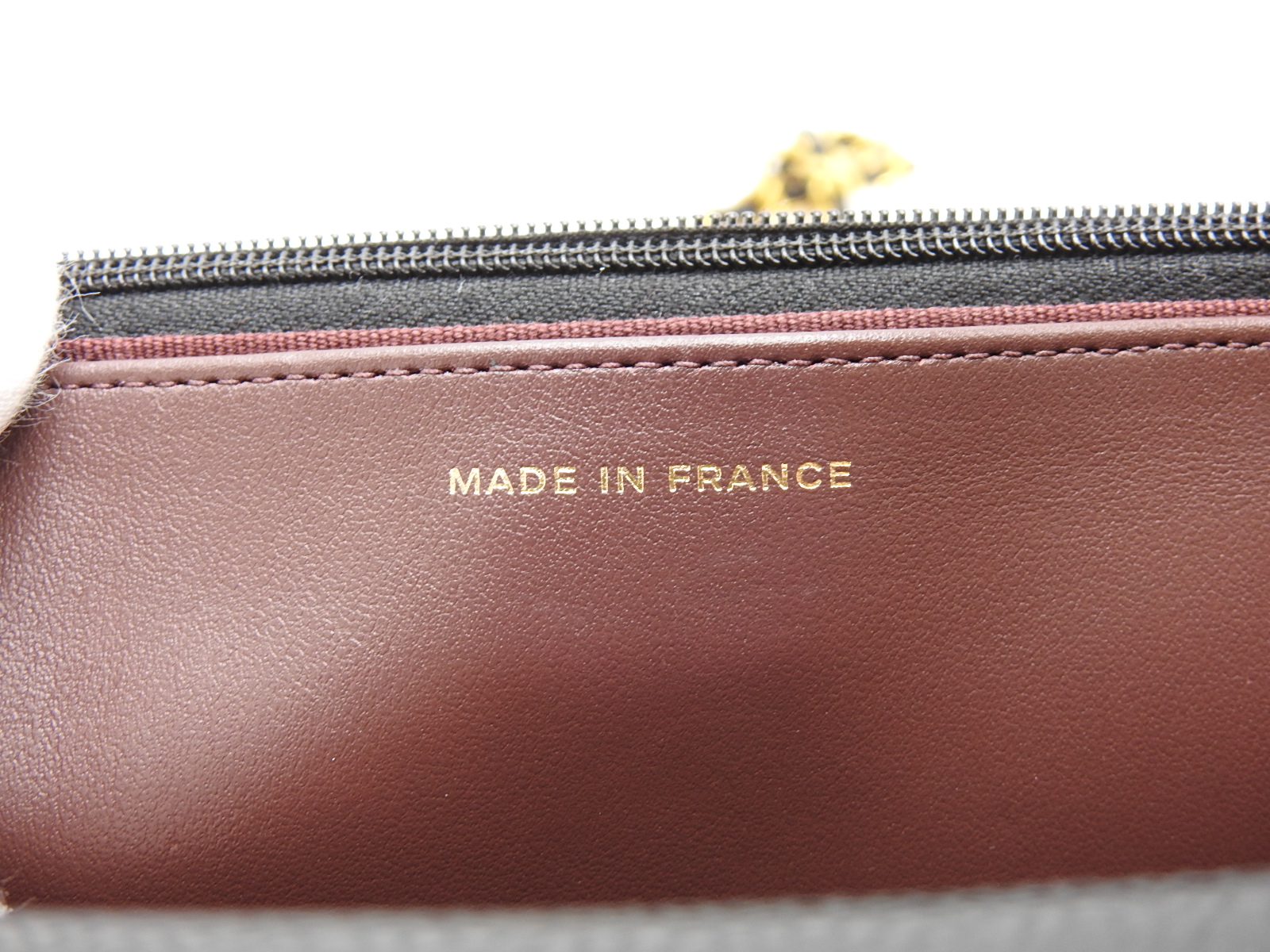 | Interior | Barely used feeling. Rarely used. A few tiny pressed marks by the zipper pull and stains inside. |