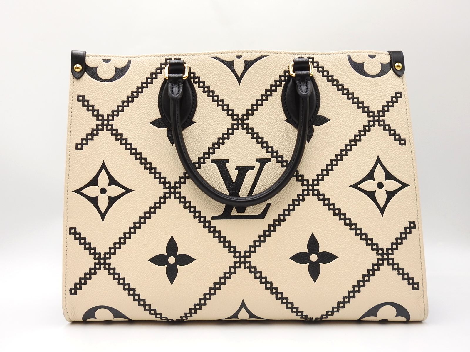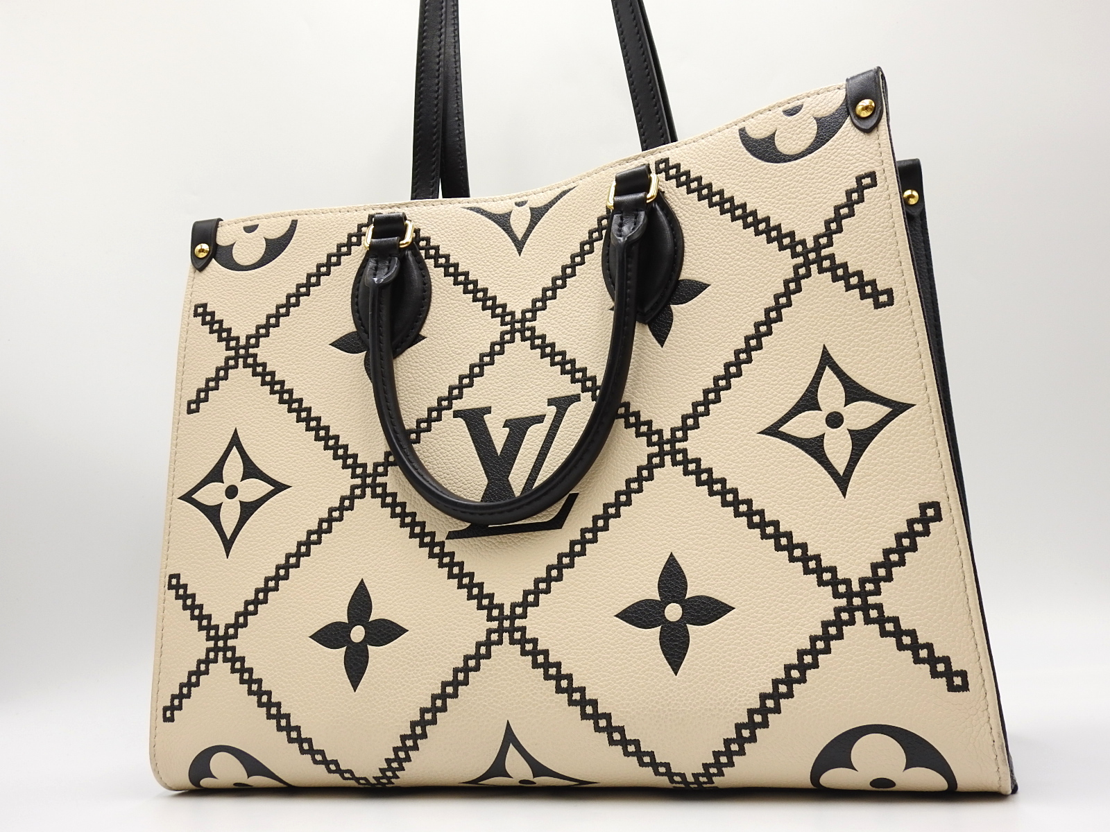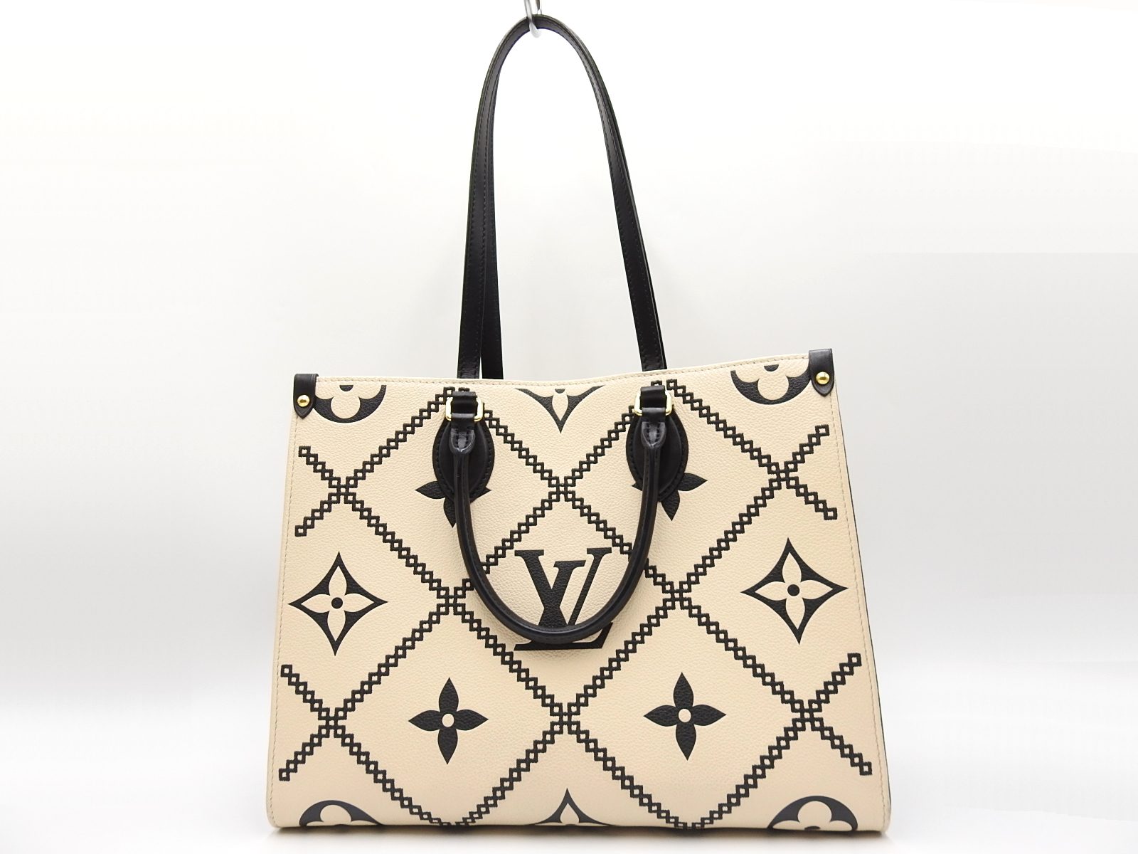 Auth LOUIS VUITTON Monogram Empreinte Giant Embroidery On The Go MM 2way Shoulder Tote Bag Cream Beige Noir Black M46016 W-7566